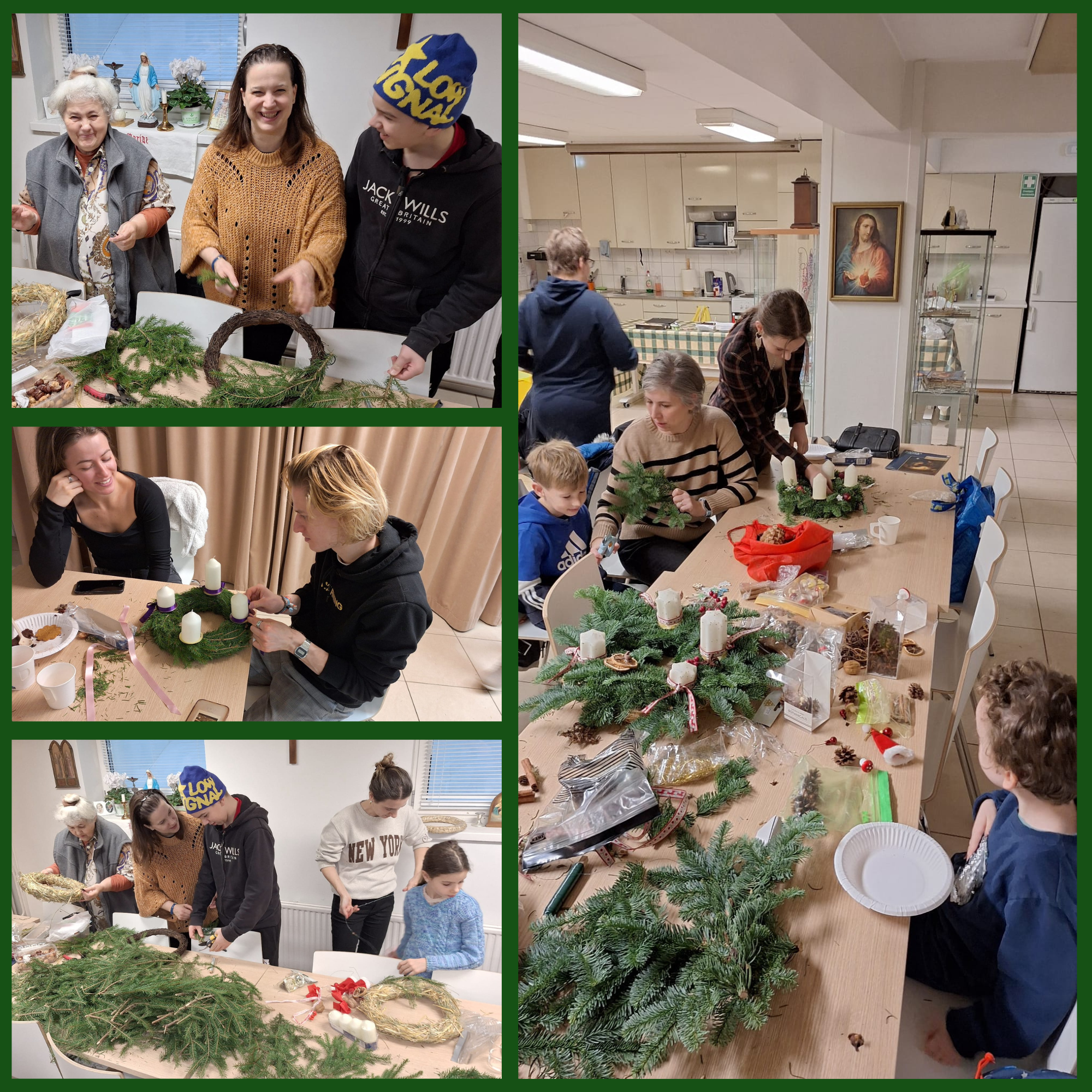 Idén is a Szűz Mária Plébánia közösségi terme adott otthont az immár hagyománnyá vált adventi koszorúkészítésnek. Szép számmal – összesen tizenkilencen – gyűltünk össze, hogy közösen, jó hangulatban és egymás szaktudását is megosztva hangolódjunk az ádventre. A meghitt légkört mindenki hozzájárulása formálta: volt, aki szervezett, mások alapanyagokat hoztak, eszközökkel vagy épp saját kézműves tapasztalatukkal segítettek, és akadt, aki finom süteménnyel tette még bensőségesebbé az alkalmat.